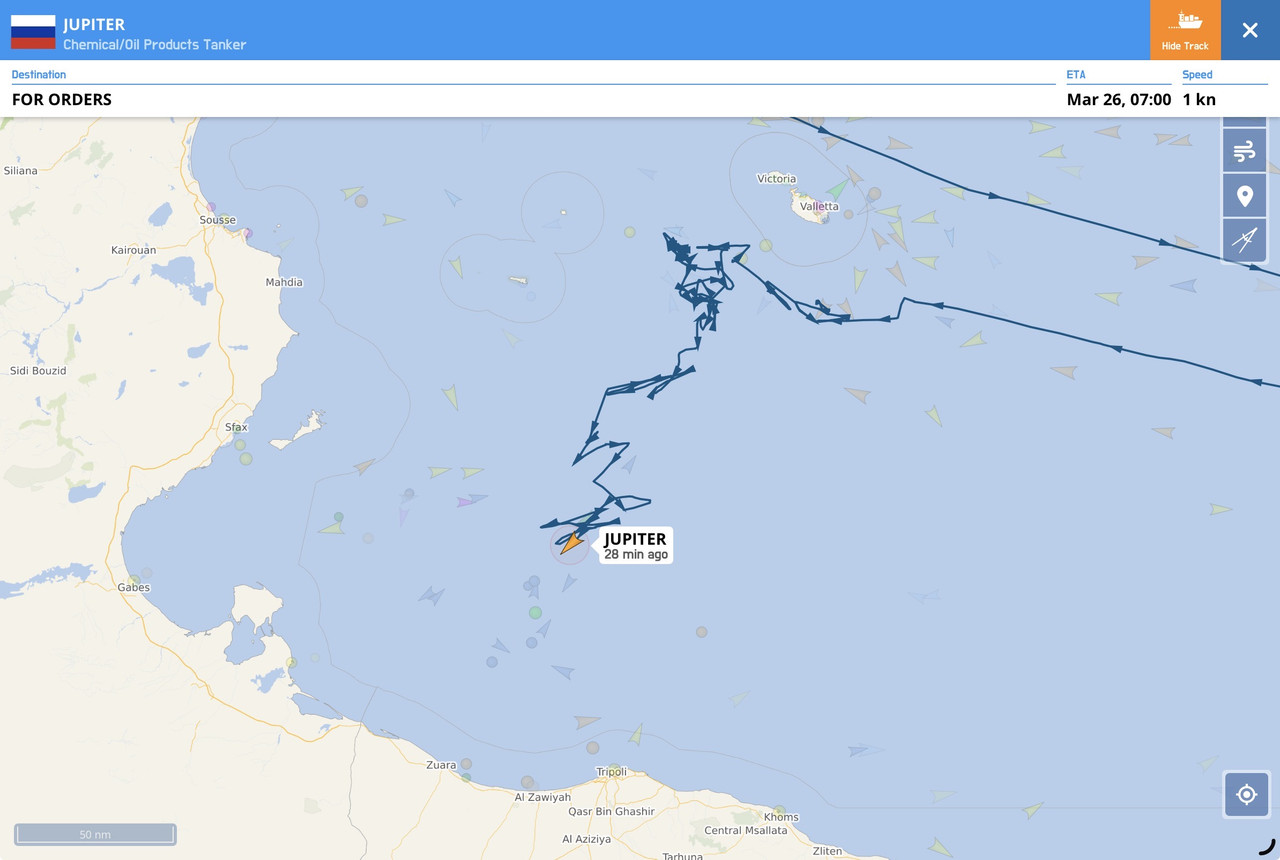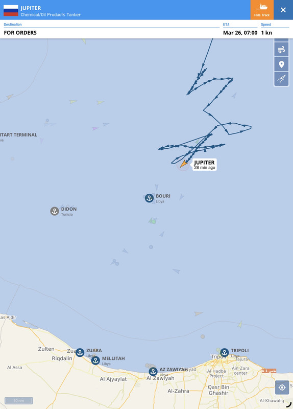 Lenže severný vietor stále fúka a časovanú bombu ženie na najväčšie Líbijské ropné pole. Rusi vrak sledujú, od 9.3. tanker Jupiter zmenil trasu a od vtedy sa pohybuje poblíž vraku. Cez AIS vysiela polohu preto je trasa vraku verejne známa. Od ropného poľa je cca 25km.