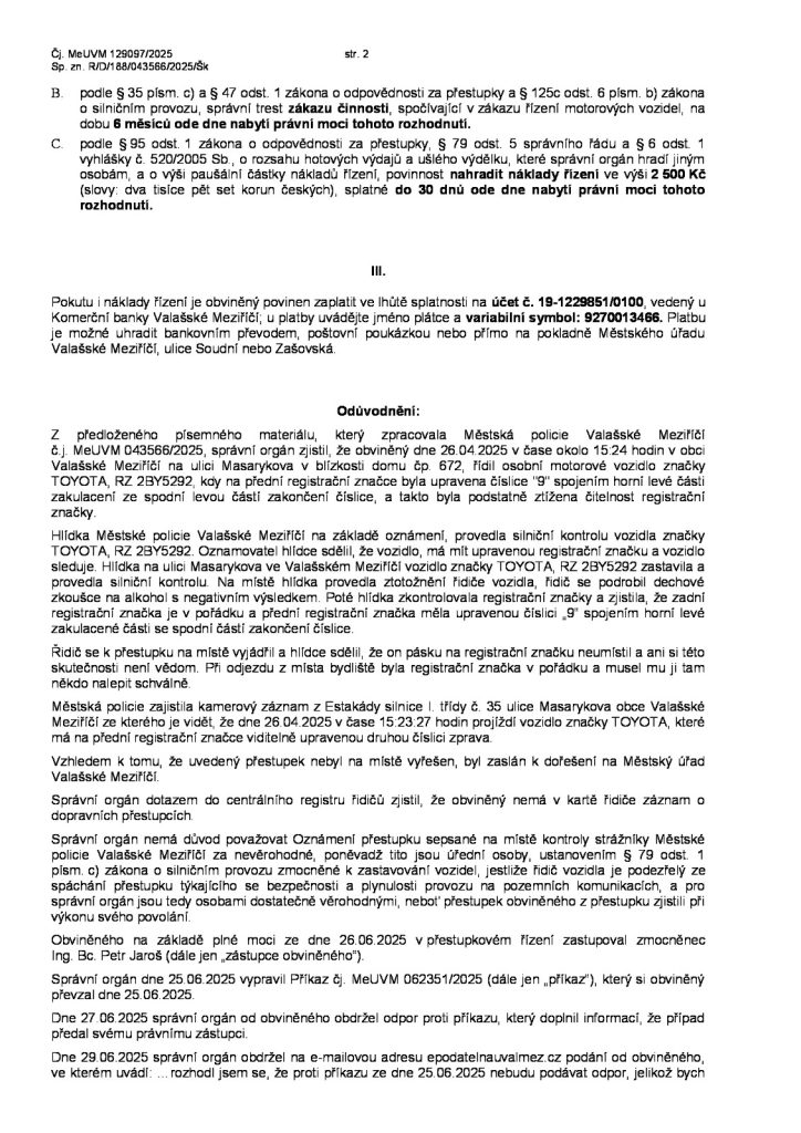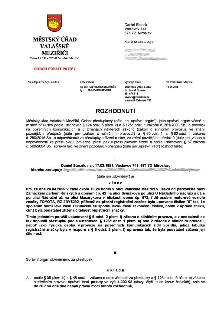 Trest – půl roku bez řidičáku, protože jízda s pozměněnou SPZ je společensky obzvláště nebezpečná.