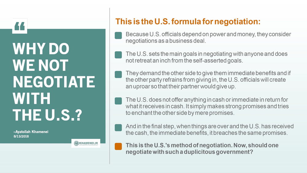 „Přesně tak. Žádná jednání – alespoň s Íránem – nebudou úspěšná, pokud budou založena na ‚našich/vašich podmínkách‘. Spojené státy se musí naučit: Íránu nemůžete diktovat podmínky,“ řekl a dodal, že „pořád ještě není pozdě se to naučit.“