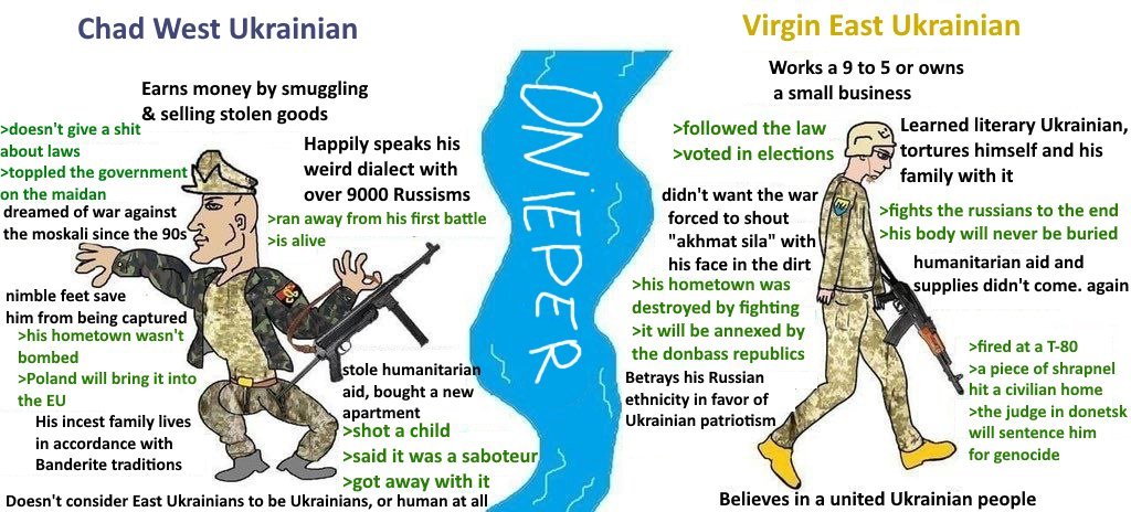 Všichni historičtí ukrajinští hrdinové, o kterých slyšíte, jako Bandera, jsou západní Ukrajinci. Ukrajinské nacionalistické organizace 20. století a zvláště období 2. světové války považují východní Ukrajince („схидняки“) za špinavé moskalské křížence; UPA (Ukrajinská povstalecká armáda) zašla tak daleko, že při čistkách v roce 1944 nechala zabít všechny své pravoslavné členy, kteří přišli z východní Ukrajiny.